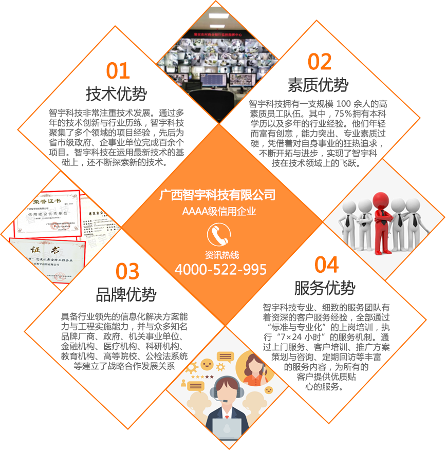 廣西智宇科技有限公司,自1995年成立以來,已發(fā)展成為一家高新技術(shù)企業(yè),擁有多家分公司,遍布南寧、桂林、玉林、河池、扶綏、百色、欽州、防城港等地。憑借30年的專業(yè)經(jīng)驗和技術(shù)儲備,智宇科技已成為一家行業(yè)領(lǐng)先的集團(tuán)企業(yè),致力于運(yùn)用前沿科技產(chǎn)品和技術(shù),為客戶提供高效服務(wù)。